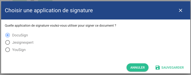 Si plusieurs applications de signature électroniques sont installées sur votre portail, vous devrez choisir DocuSign dans la fenêtre qui s'ouvre.