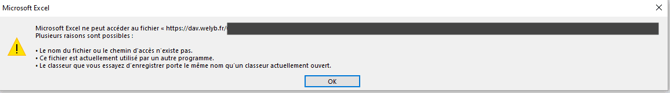 En double-cliquant sur le fichier sur Welyb, Microsoft Office s'ouvre, puis le message suivant s'affiche :