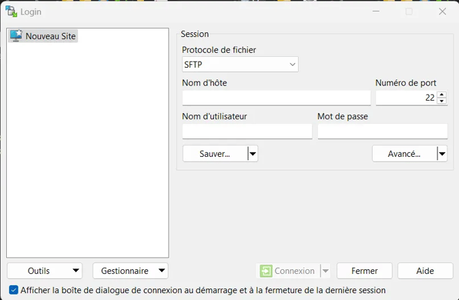 Pour se connecter au SFTP, nous vous recommandons d’utiliser l’utilitaire WinSCP, un outil open source de référence. Après avoir réalisé l’installation avec les paramètres par défaut, un écran de connexion, similaire à celui ci-dessous, s’ouvrira automatiquement :
