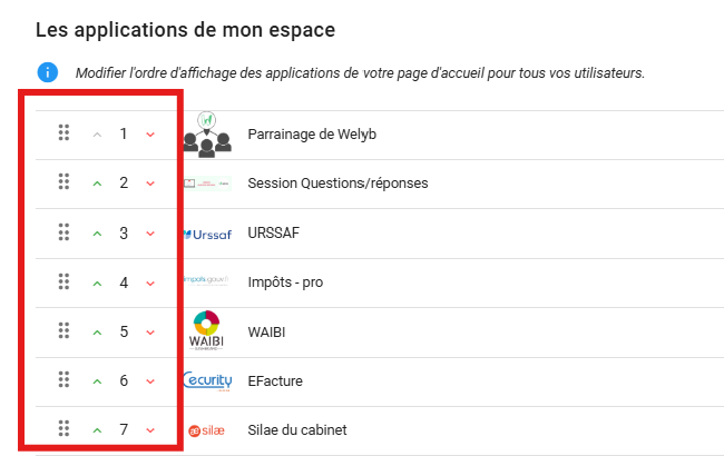 Vous pouvez alors glisser / déposer vos applications d'accueil pour en modifier l'ordre d'apparition, ou les faire descendre/monter avec les flèches visibles au début de chaque ligne.