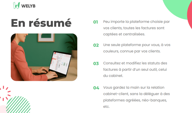 Pour accompagner les experts-comptables dans cette transition, Welyb renforce son positionnement : une plateforme souveraine, collaborative et compatible avec l’écosystème de la facture électronique, en conservant un objectif simple : réduire la complexité, centraliser les flux, et vous laisser le choix de vos outils.
